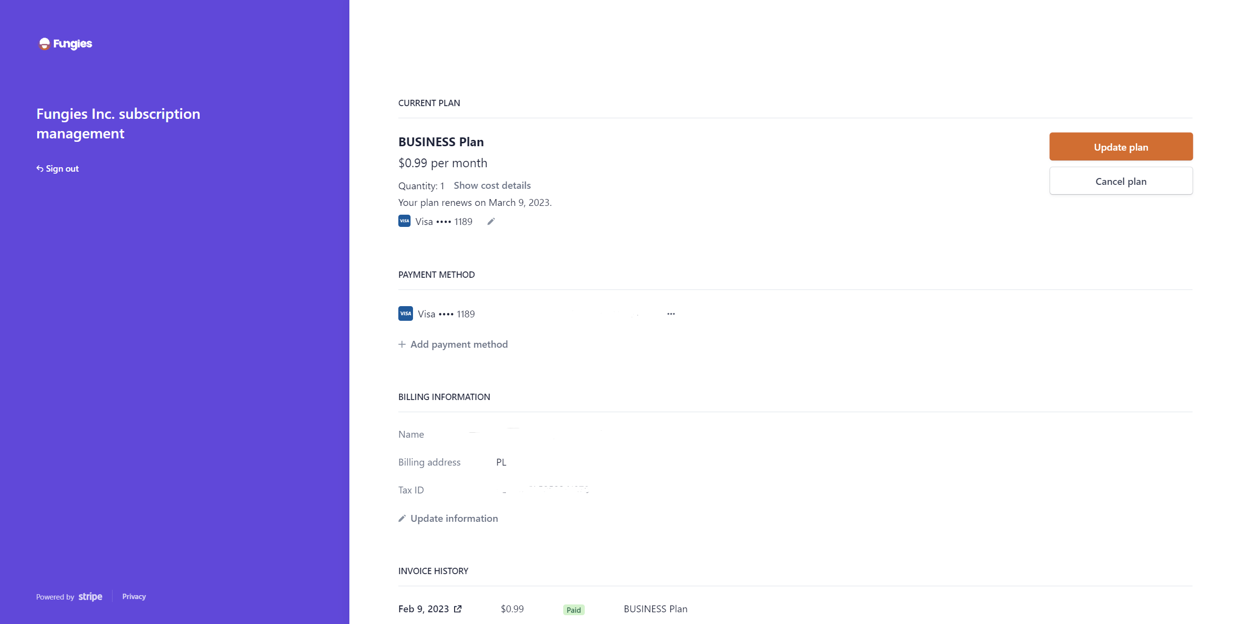 In order to retrieve your invoices or manage your current subscription, you can access Stripe's Customer Portal under this link: <https://billing.stripe.com/p/login/5kA02VaoN21xcIo3cc>&#x20;